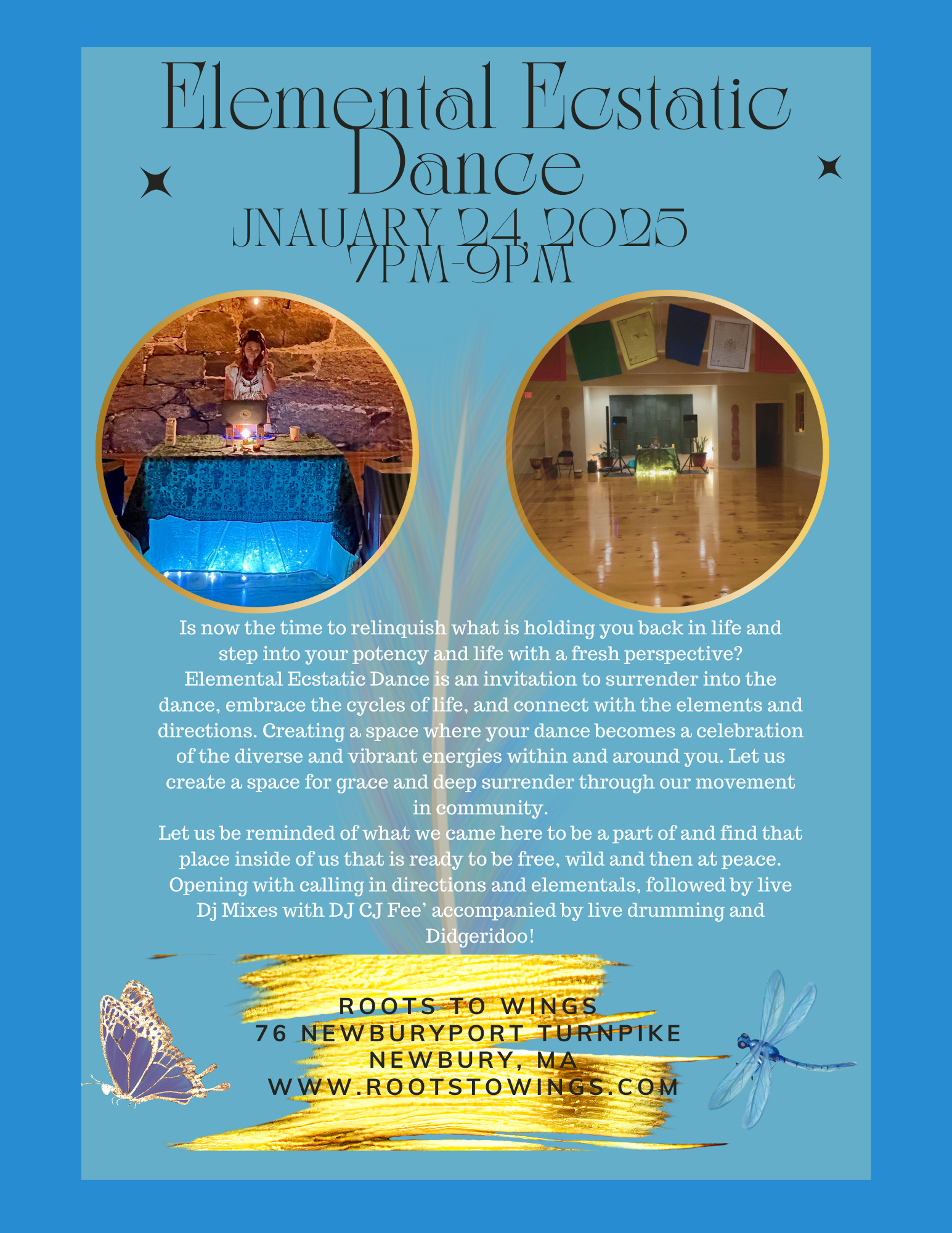 Back to All Events Elemental Ecstatic Dance Roots to Wings Friday, January 24, 2025 7:00 PM 9:00 PM Google Calendar ICS Sign UP